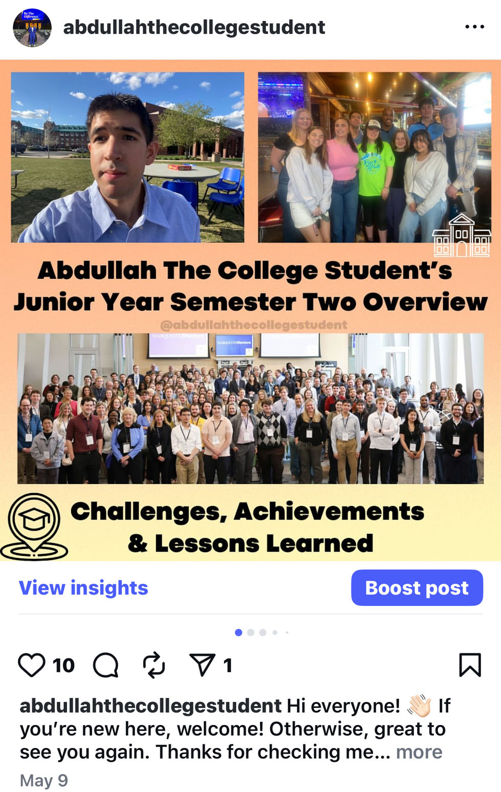 Manage Instagram page documenting authentic commuter college experiences with the goal of creating a space for students to learn from each other. Share honest reflections on work-life balance as a commuter, professional growth through networking events and career planning, and advice from lessons learned along the way. Publish trimesterly content increasing engagement by 97.5% [Instagram Insights]. Design visuals with Canva resulting in 69% boost in Instagram interactions and stronger audience retention.